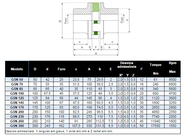 • Tolerância a Desvios: O sistema suporta desvios admissíveis angulares de até 2,0º (X), axiais de até 5,0 mm (Y) e radiais de até 1,8 mm (Z), garantindo a proteção e o bom funcionamento dos eixos acoplados.