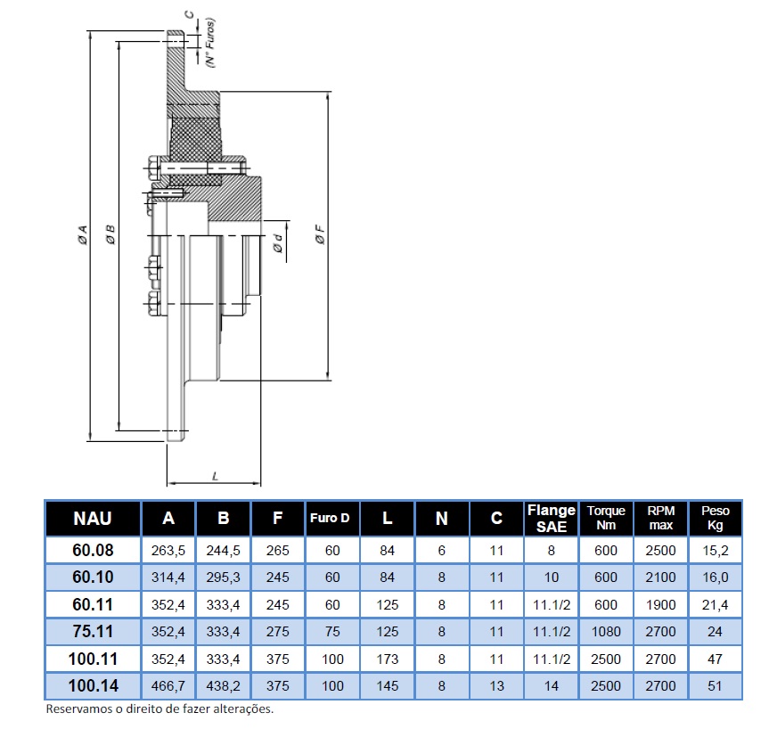 Sua construção robusta e eficiente é composta por uma flange fabricada conforme a norma SAE, um cubo fixado por parafusos e um elemento elástico de borracha em peça única, que conta com reforço interno.